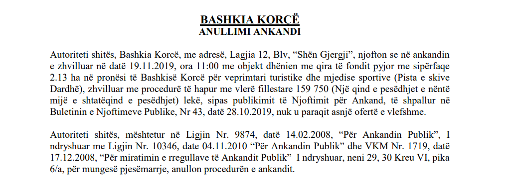 Anulimi i Tenderit Buletini Nr. 47 datë 25 Nëntor 2019