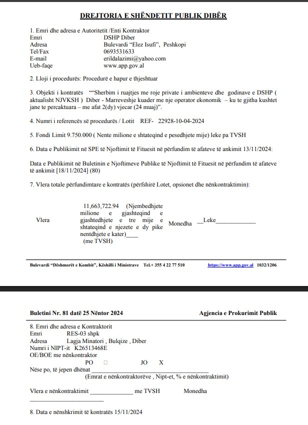 | Objekti i Tenderit | Sherbim i ruajtjes me roje private i ambienteve dhe godinave e DSHP ( aktualisht NJVKSH ) Diber | ||||||||||||