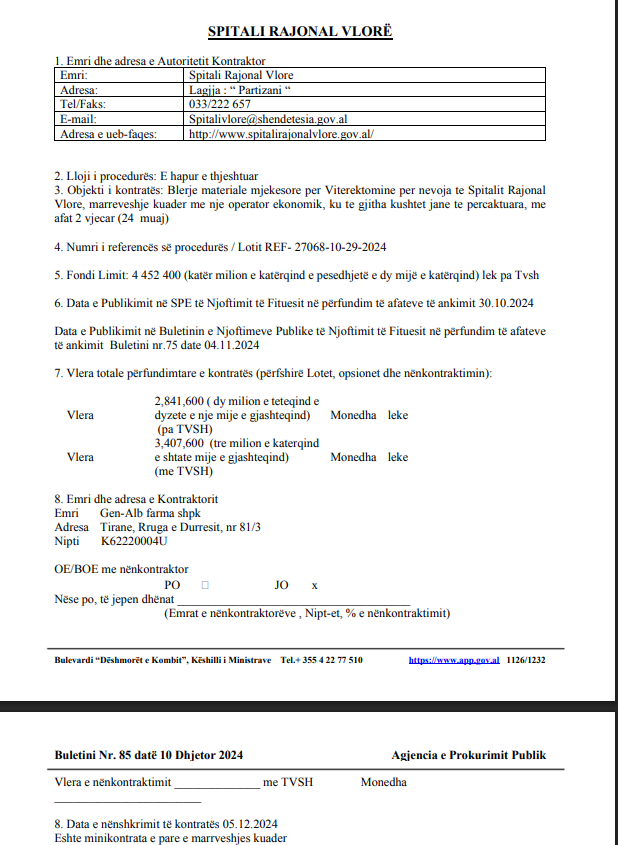 • Buletini i Prokurimeve Publike Kontrata te lidhura ne baze te Marreveshjes Kuader Spitali Rajonal Elbasan REF-27068-10-29-2024