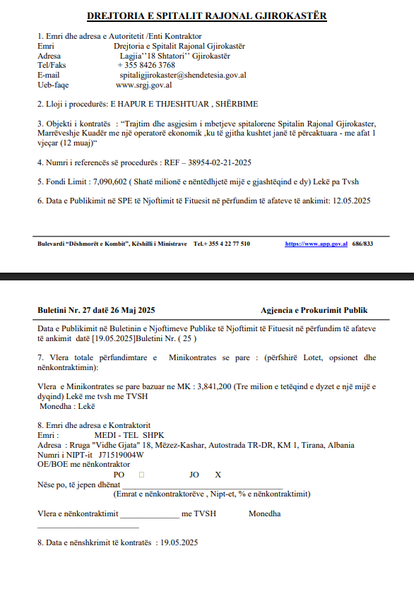 ( Minikontrata 1 )“Trajtimi dhe asgjesimi i mbetjeve spitalore ne Spitalin Rajonal Gjirokaster Marrëveshje Kuadër - me një operator ekonomik ku të gjitha kushtet janë të përcaktuara - me afat 12 muaj” Burimi i financimit: FSDKSH |