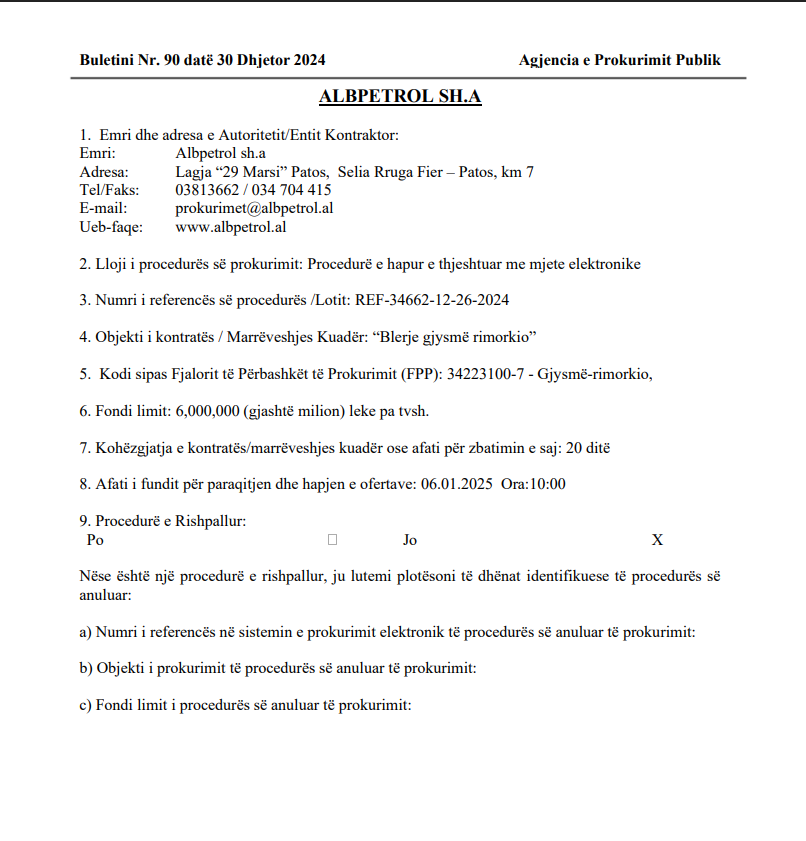 | Autoritet Prokurues | Sh.A Albpetrol | Objekti i Tenderit | Blerje gjysmë rimorkio | |