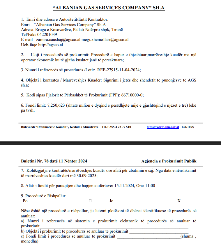 | Autoritet Prokurues | Albanian Gas Service Company Sh.a | Objekti i Tenderit | Sigurimi i jetës dhe shëndetit të punonjësve të AGS sh.a |